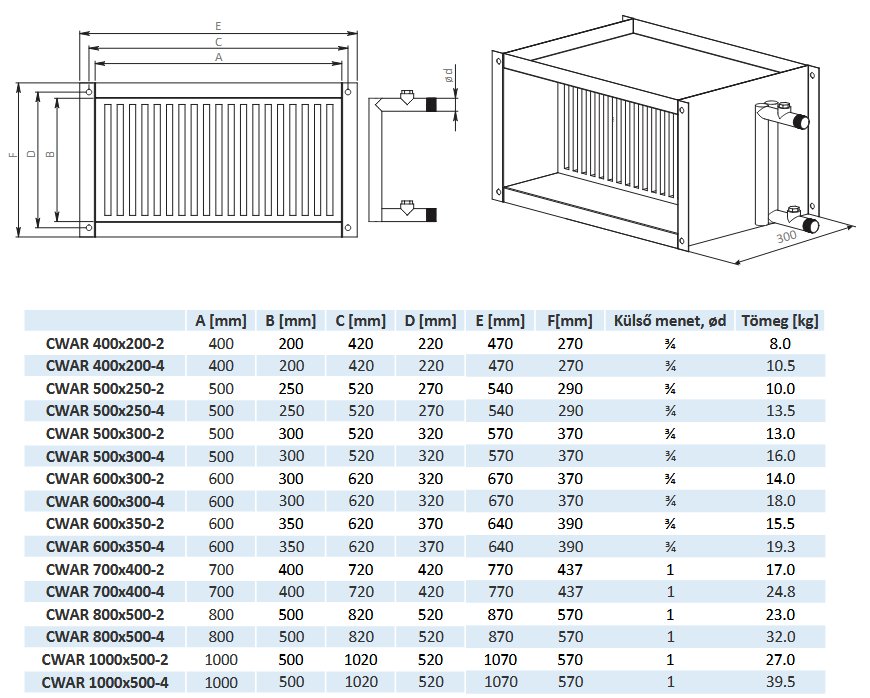 CWAR-4  400 x 200 melegvizes fűtőkalorifer négyszög légcsatornákhoz (4 fűtőkörös, max. 19,3 kW)